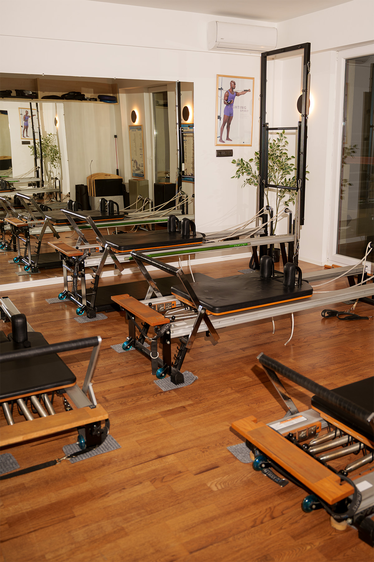 A kis terem 4 prémium STOTT reformer géppel, a nagy terem 5 RYB reformer pilates géppel felszerelt.